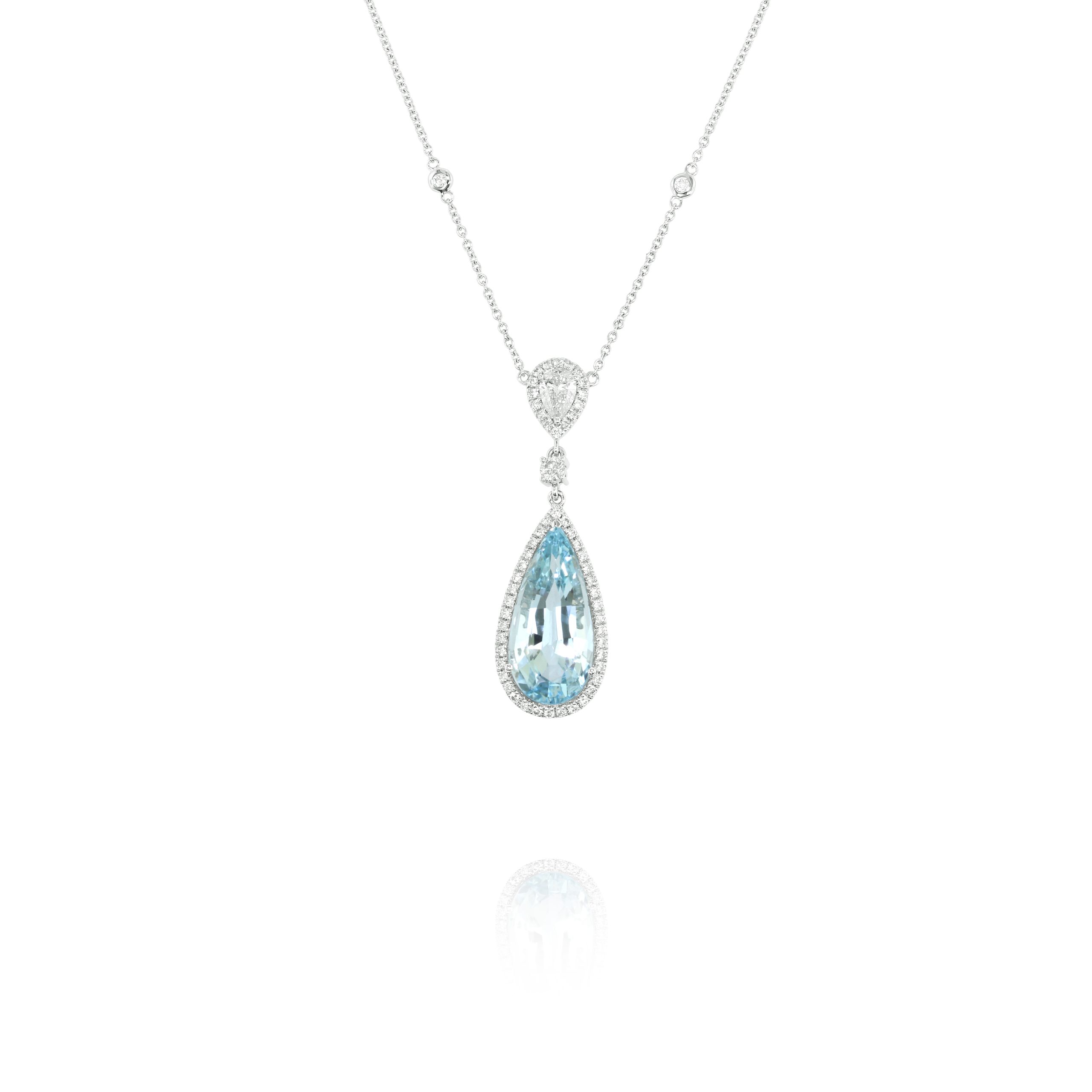 Gracefully refined, this pendant features a luminous 5.19-carat pear-shaped aquamarine, encircled by a halo of brilliant round diamonds. A sparkling 0.35-carat white diamond sits just above, adding depth and radiance, all set in polished 18kt white gold. With 0.64 carats of additional diamonds accenting the bale and chain, this piece is perfe for marking unforgettable moments or adding a touch of brilliance to formal occasions. A stunning expression of elegance and beauty.
