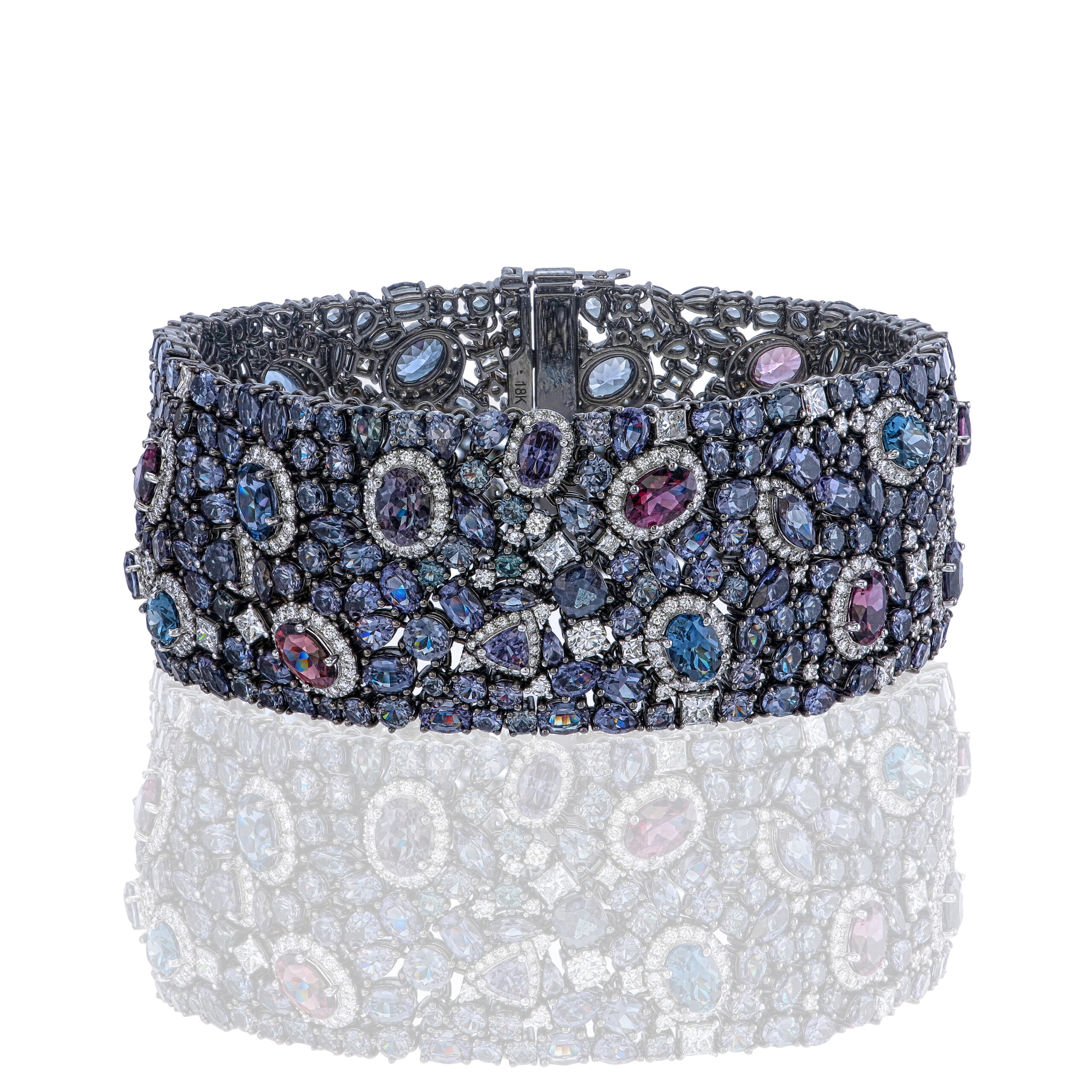 This breathtaking 18kt white gold cuff showcases a mix of color change garnets and spinels, accented by white diamonds. The intricate design evokes a cascade of shimmering light, perfe for making a bold statement at elegant occasions.
