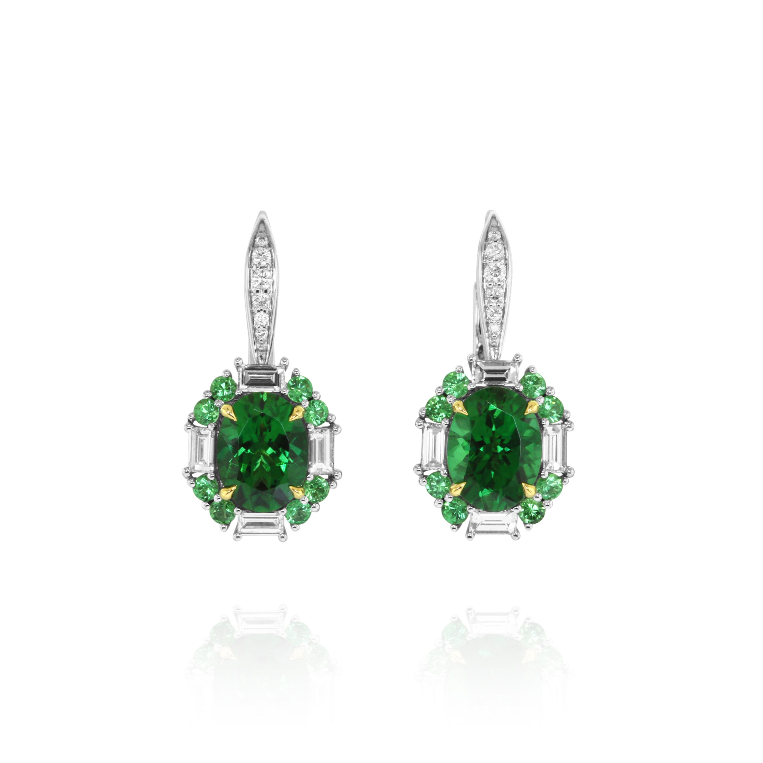 Lustrous 2.38 tsavorites sparkle in these drop earrings, accented by 0.49 of baguette diamonds and 0.45 of round tsavorites. A refined pairing of brilliance and bold green.