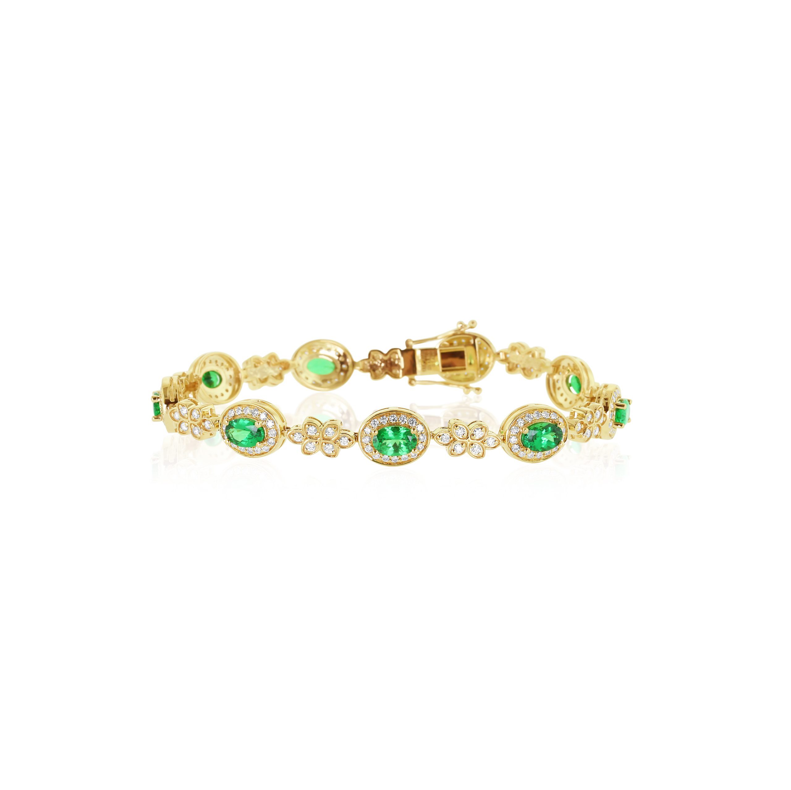 A luxurious statement piece, this 18kt yellow gold bracelet showcases 4.46 of vibrant tsavorite and 1.43 of diamonds in a regal repeating motif. Elegant from every angle.