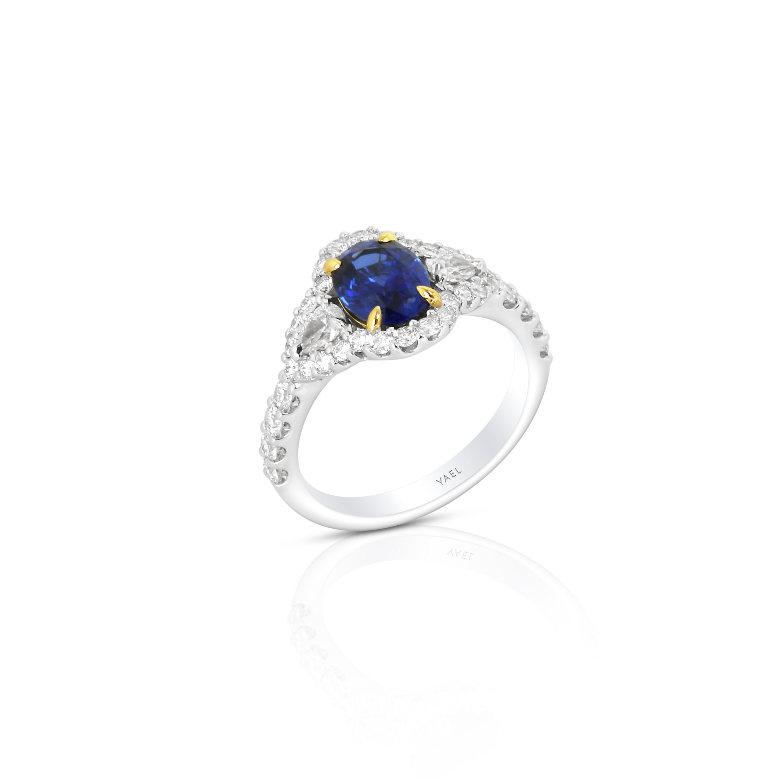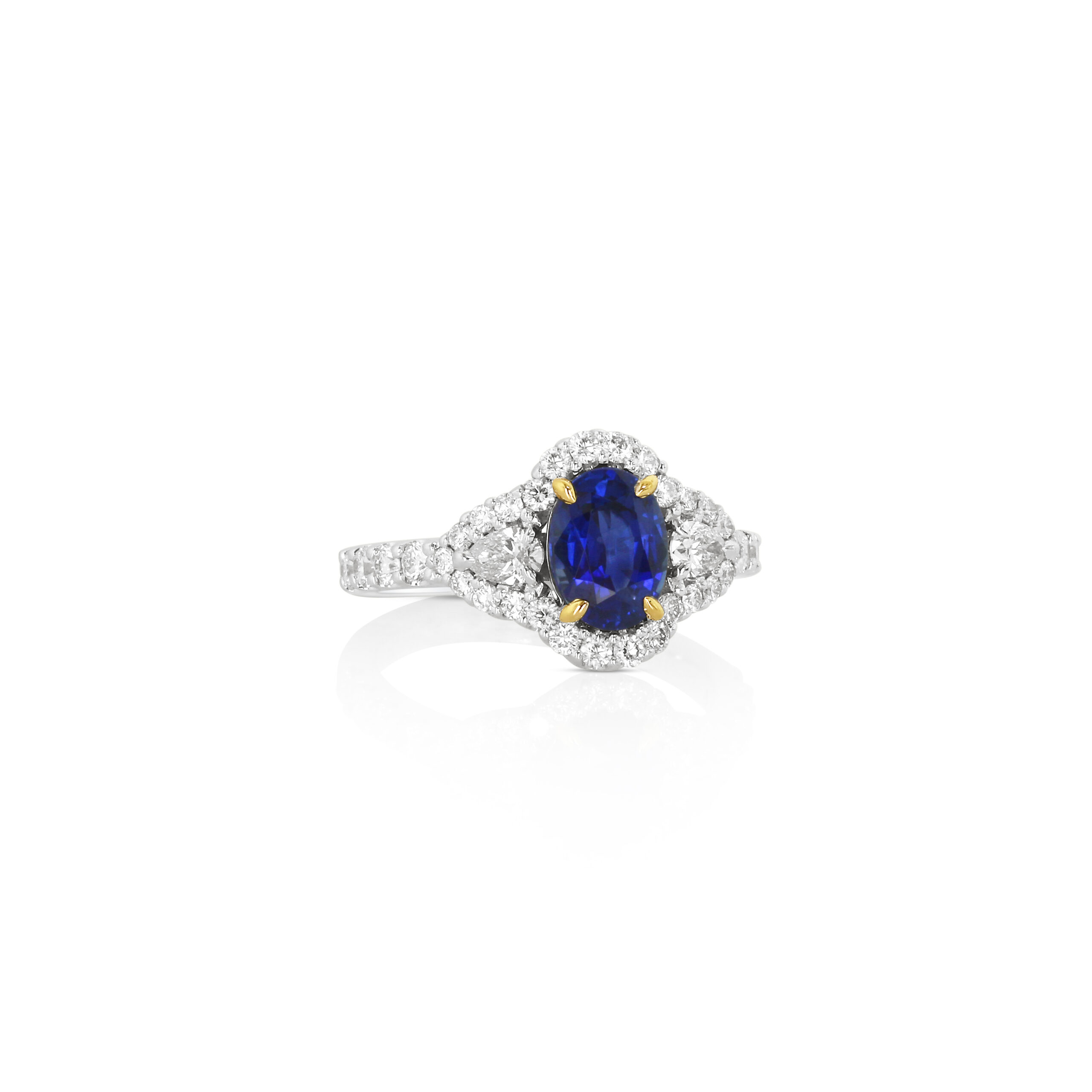 A striking oval blue sapphire sits boldly at the center, its vivid royal hue intensified by yellow gold prongs that add warmth and contrast. Encircling the center stone is a radiant halo of round diamonds, while pear-shaped diamonds extend along the sides, creating a soft, petal-like silhouette. The diamond-adorned band enhances the overall brilliance, offering sparkle from every angle. Expertly crafted in platinum with 18kt yellow gold accents, this ring combines enduring strength with refined detail. The 1.73 carat sapphire is complemented by 0.92 carats of mixed diamond shapes, delivering a dynamic interplay of light and texture.