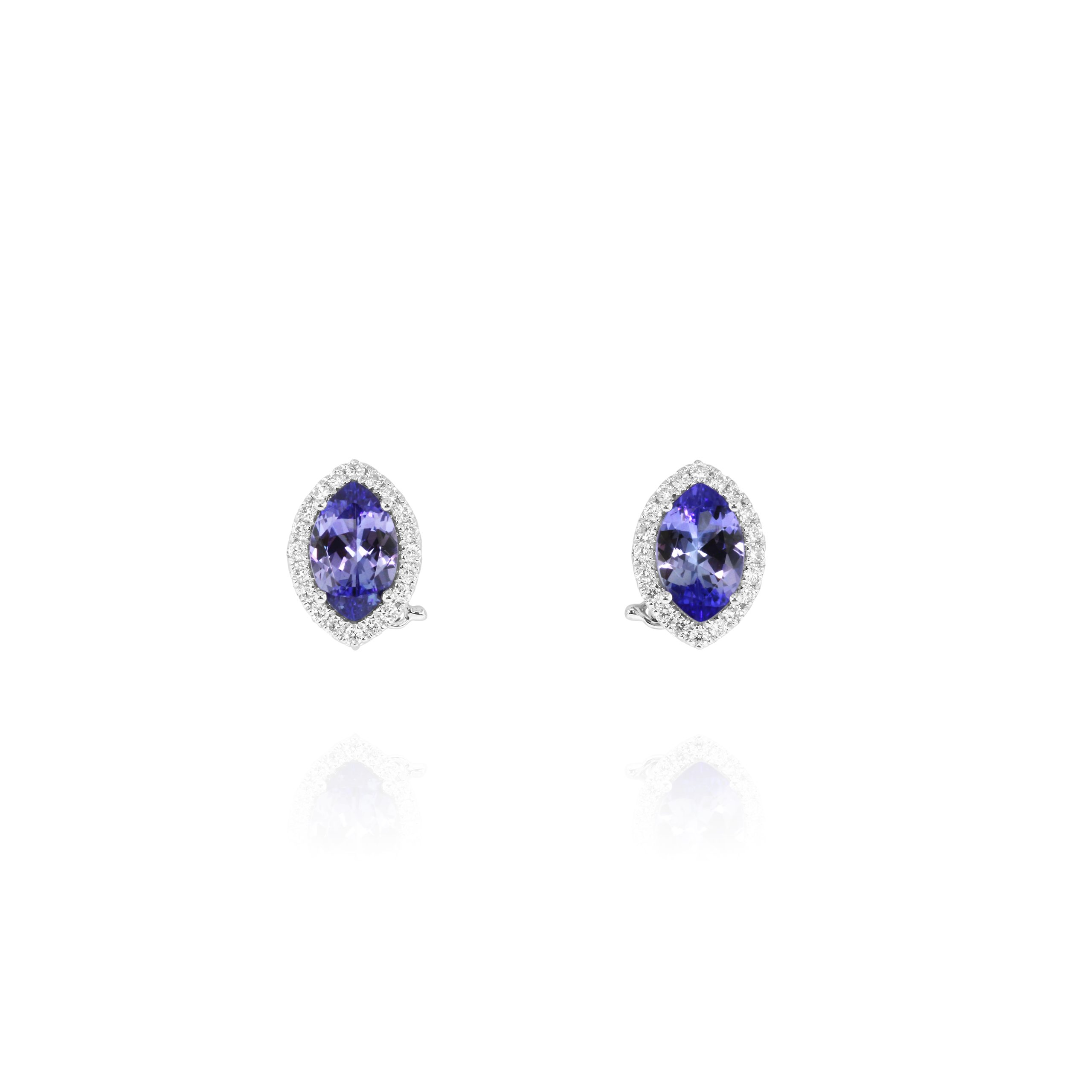 Crafted in 18kt yellow and white gold, these dramatic earrings feature 11.38 of richly saturated pear-shaped Tanzanites surrounded by 1.55 of round diamonds. A stunning blend of bold color and brilliance.