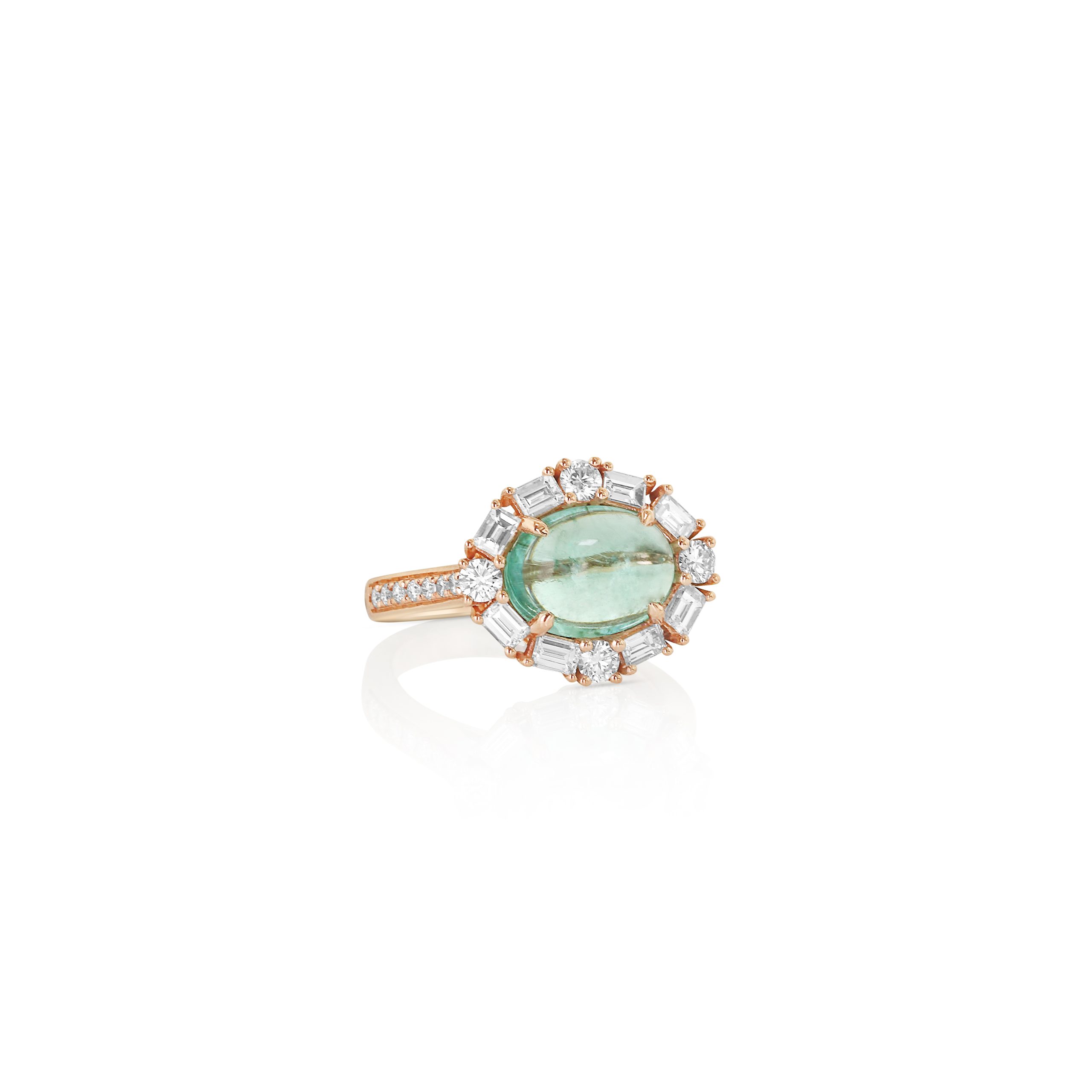 Crafted in glowing 18kt rose gold, this 2.92 oval Paraiba is flanked by 0.57 of baguette diamonds and 0.42 of white round diamonds. The blush-toned setting adds a soft romantic contrast to the gem’s cool ocean hue. A graceful design with vintage flair.