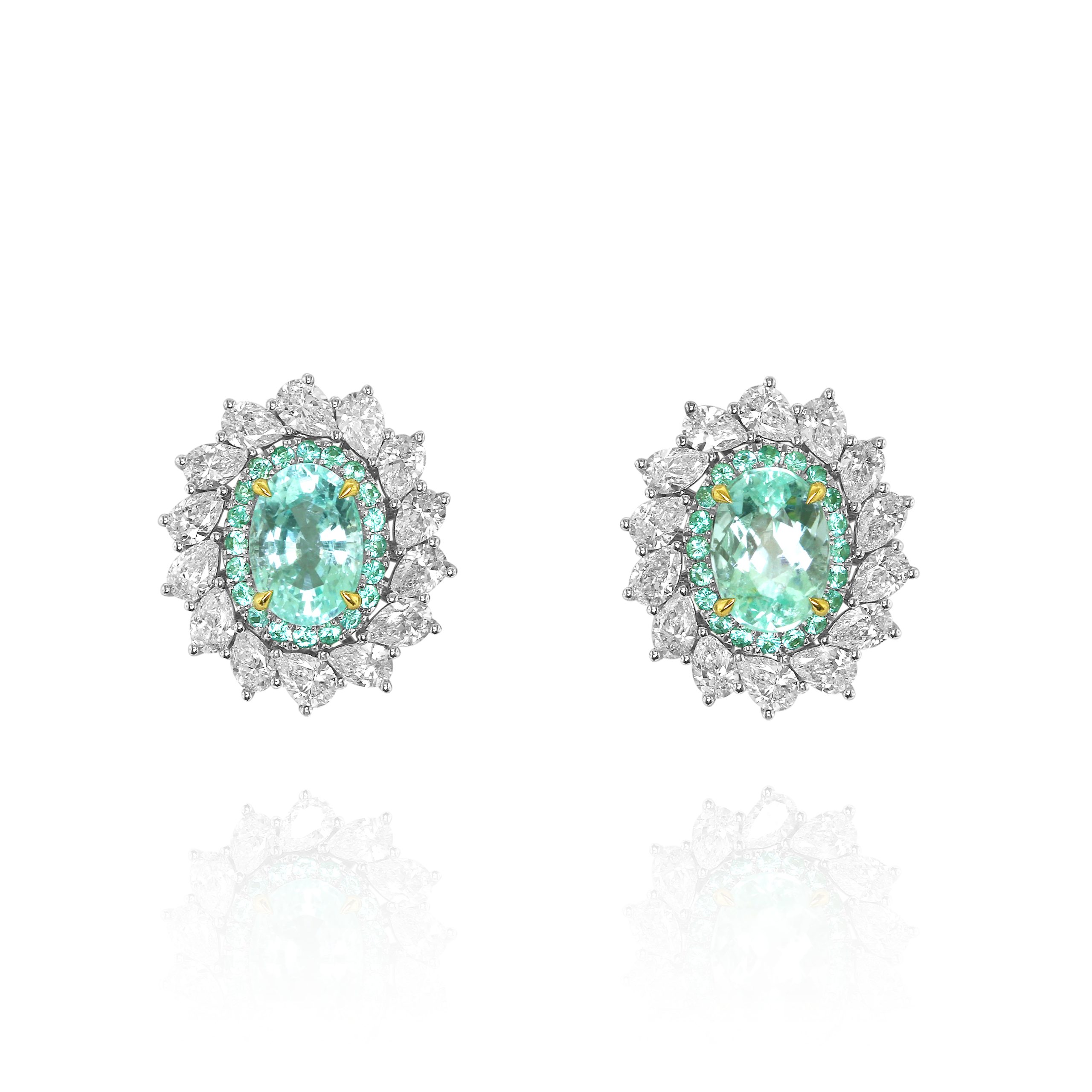 Set in 18kt white gold, these ornate earrings highlight 1.76 of vivid oval Paraiba surrounded by 1.28 of white diamonds and 0.19 of round Paraiba. Intricate and luminous, they create a radiant burst of color. A statement pair made for elegant evenings.