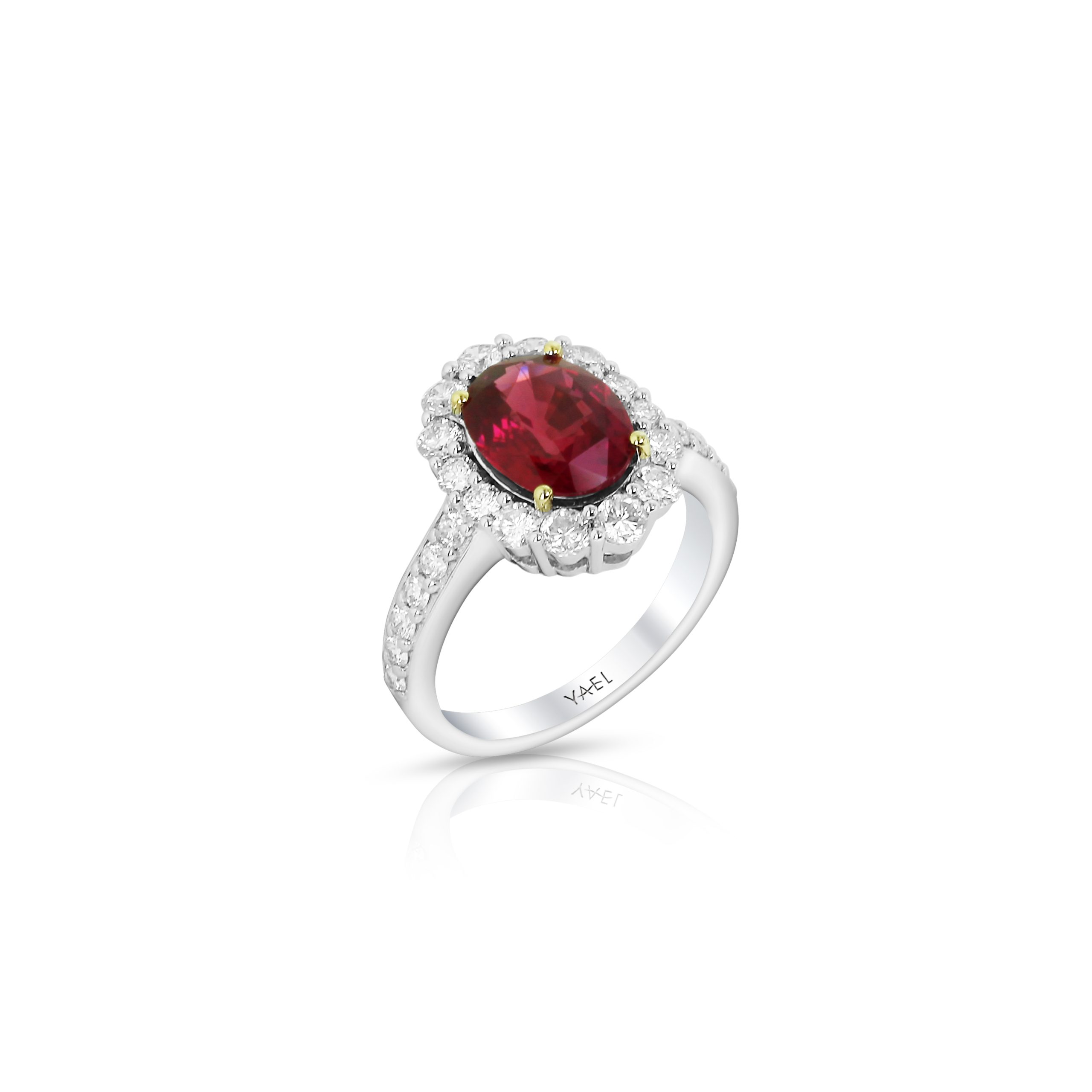 A spe acular 3.04 GRS-certified ruby takes center stage in this 18kt white and yellow gold ring, surrounded by 1.17 of VS diamonds. A true statement of luxury and refinement. Designed to be cherished for a lifetime.