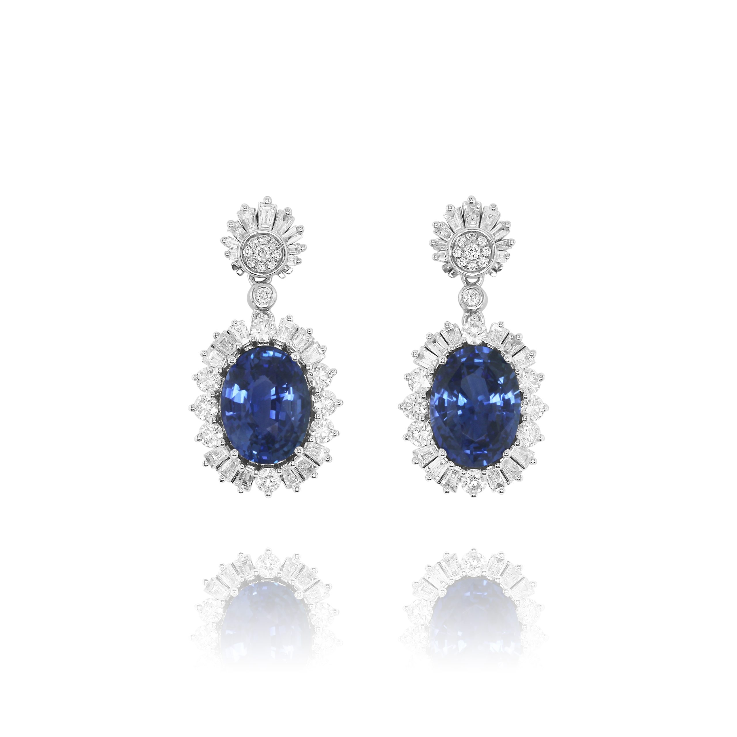 These dazzling 18kt white gold drop earrings feature 8.28 of vivid cornflower sapphires and 2.01 of diamonds in a classic floral-inspired design. Refined, glamorous, and perfe for evening elegance.