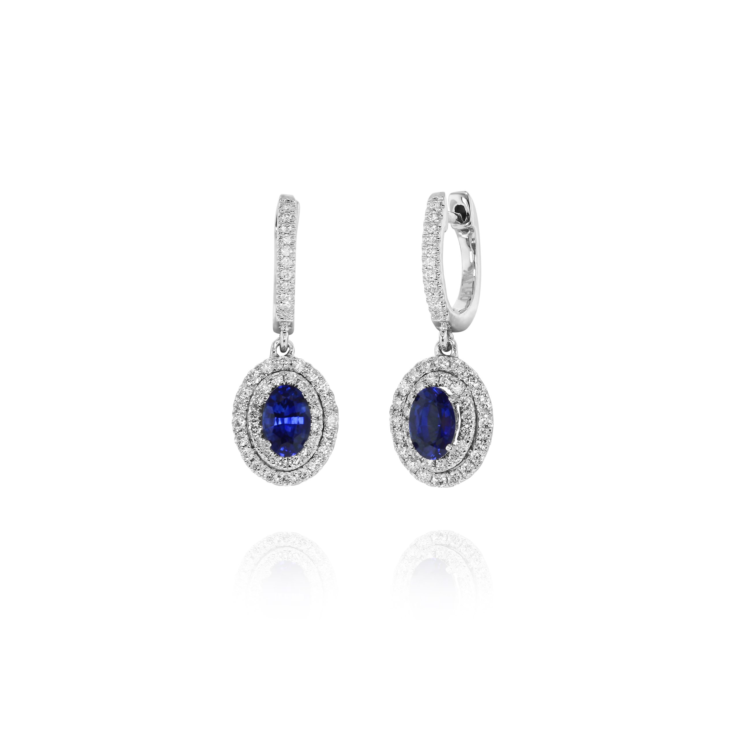 These delicate earrings feature 1.11 oval blue sapphires (6X4mm), encircled by 0.58 of sparkling diamonds. Set in polished 14kt white gold, perfe for adding a touch of sophistication to any evening look.