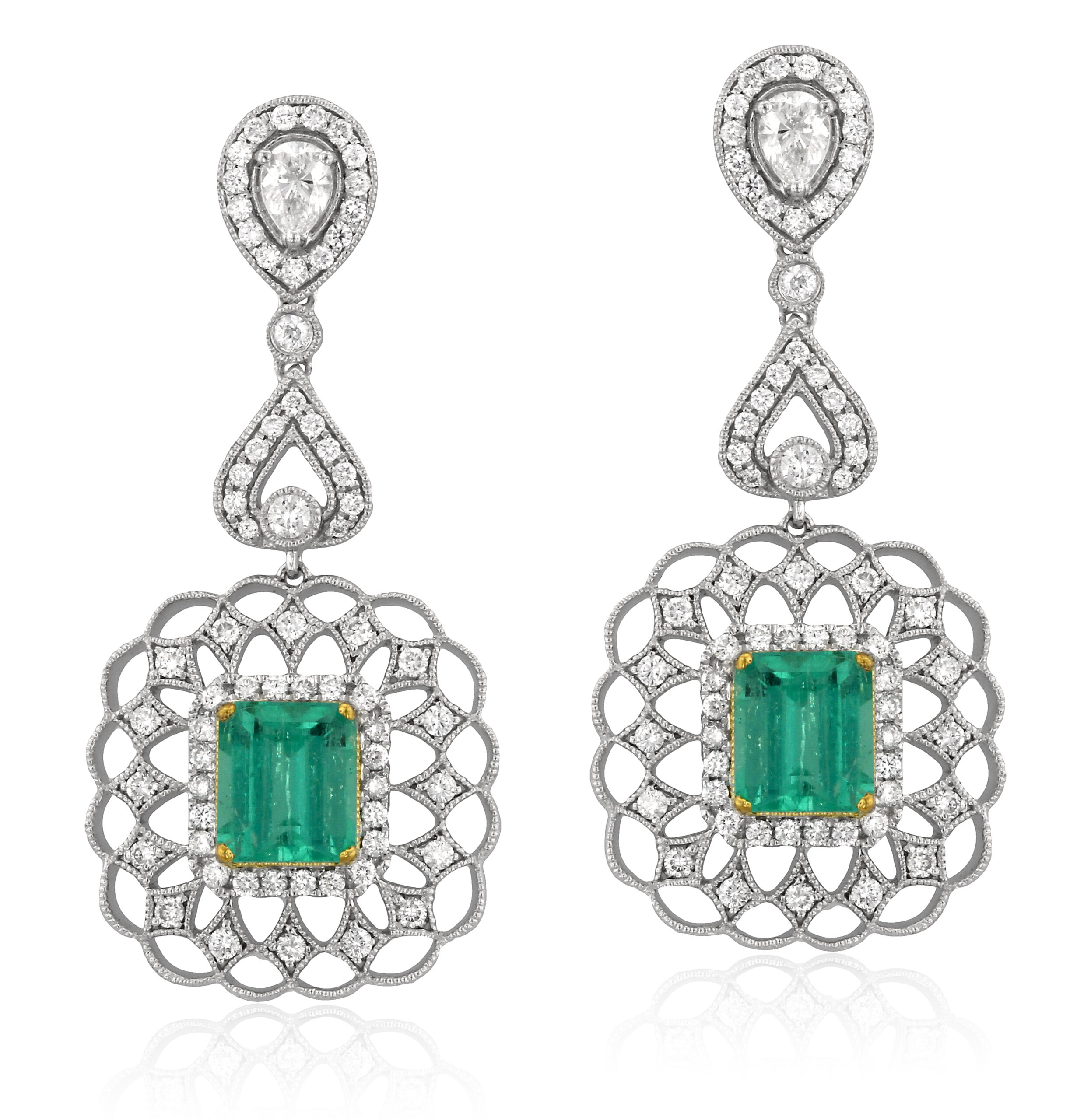 These stunning earrings showcase 3.63 emeralds with 0.41 pear-shaped diamonds and 1.27 additional diamonds. A refined choice for those who love statement jewelry with timeless grace.