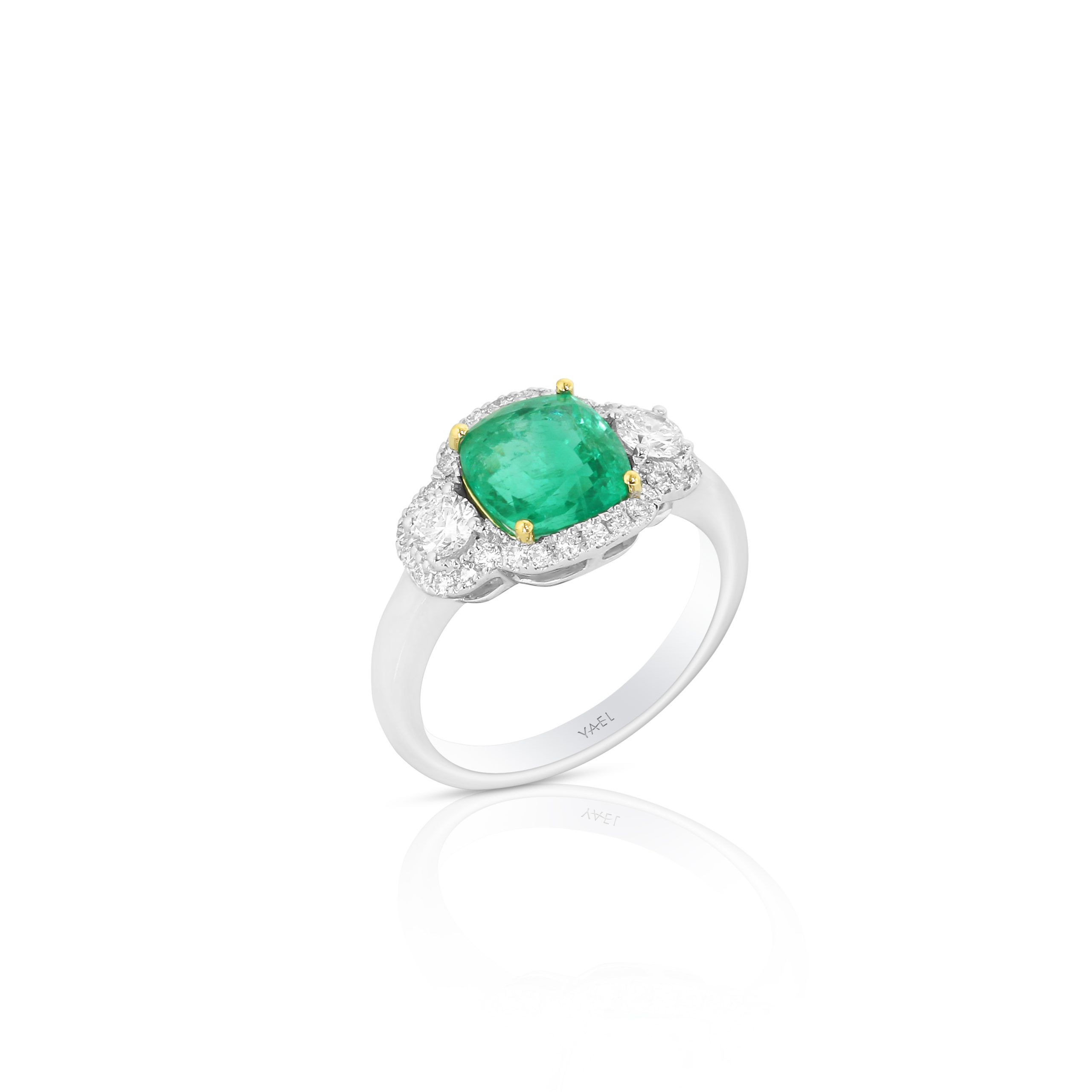 Showcasing a vivid 2.34 cushion-cut emerald, this stunning ring is framed by 0.56 of brilliant diamonds in an intricate two-tone gold setting. A timeless piece to honor life’s milestones and add elegance to every occasion.