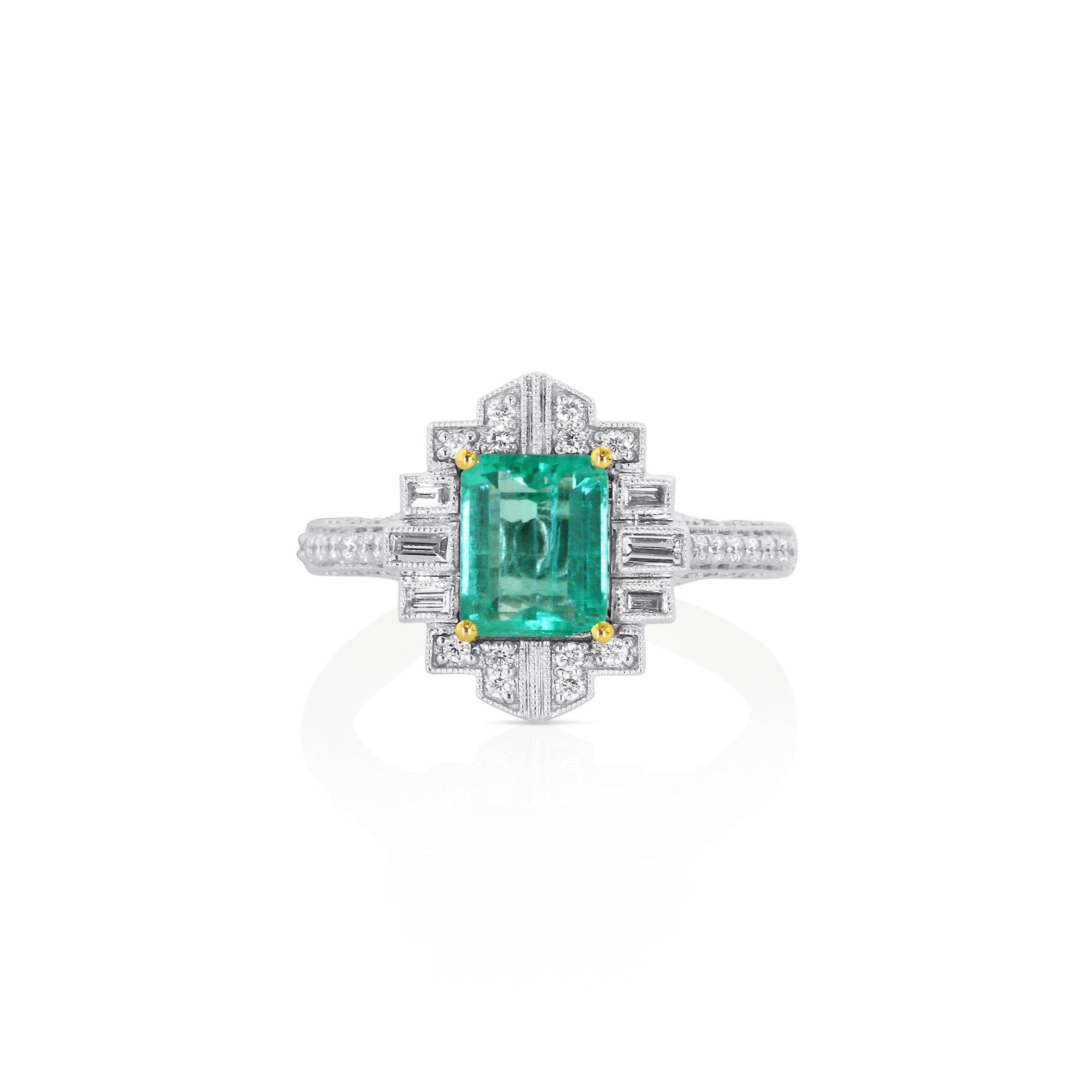 A bold 1.32 emerald is the centerpiece of this geometric two-tone design, accented by 0.33 of sparkling diamonds. A distin ive choice for those who favor statement luxury and refined craftsmanship.