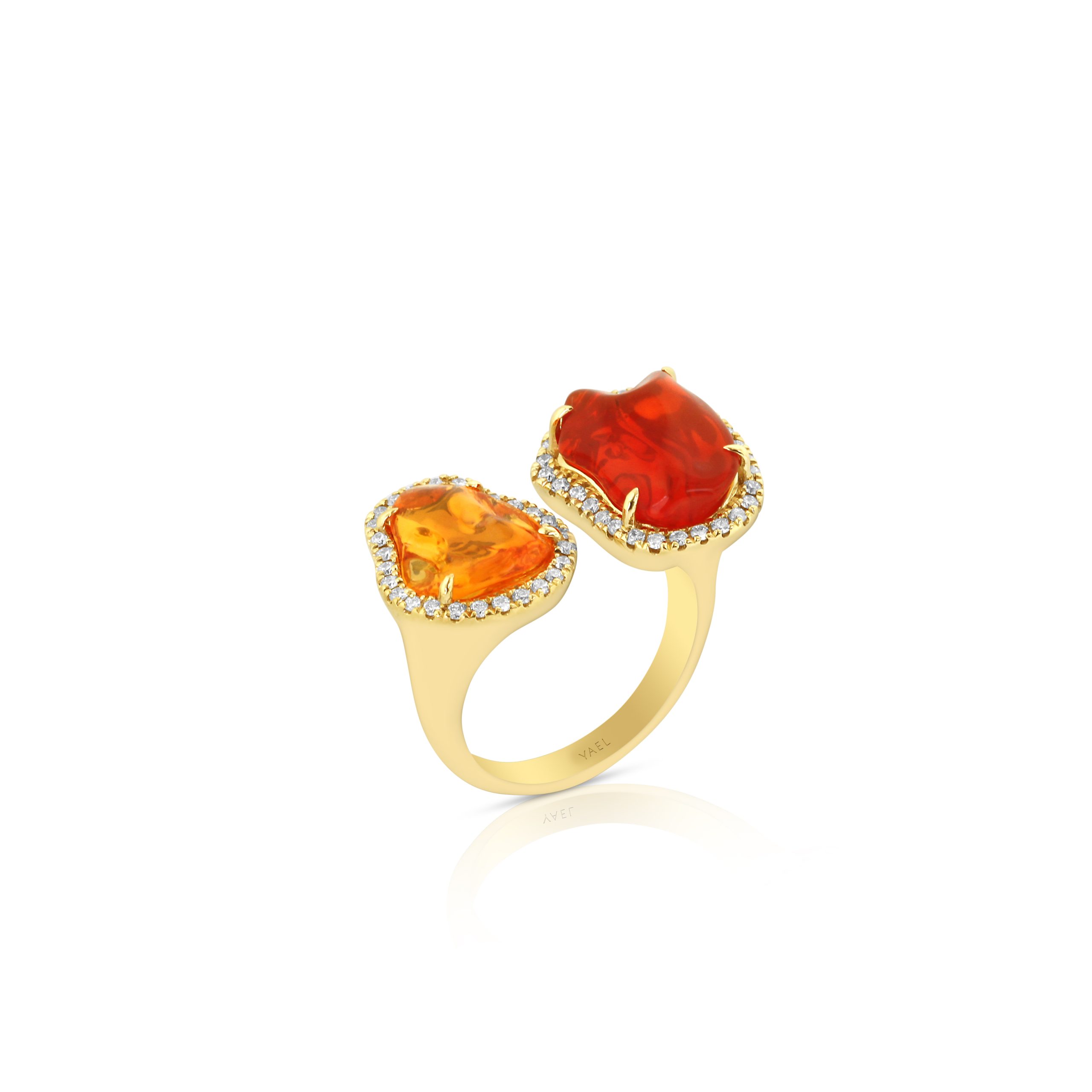 Two captivating fire opals — 1.52 and 2.93 — are accented with 0.44 diamonds, creating fiery brilliance and opulent charm.