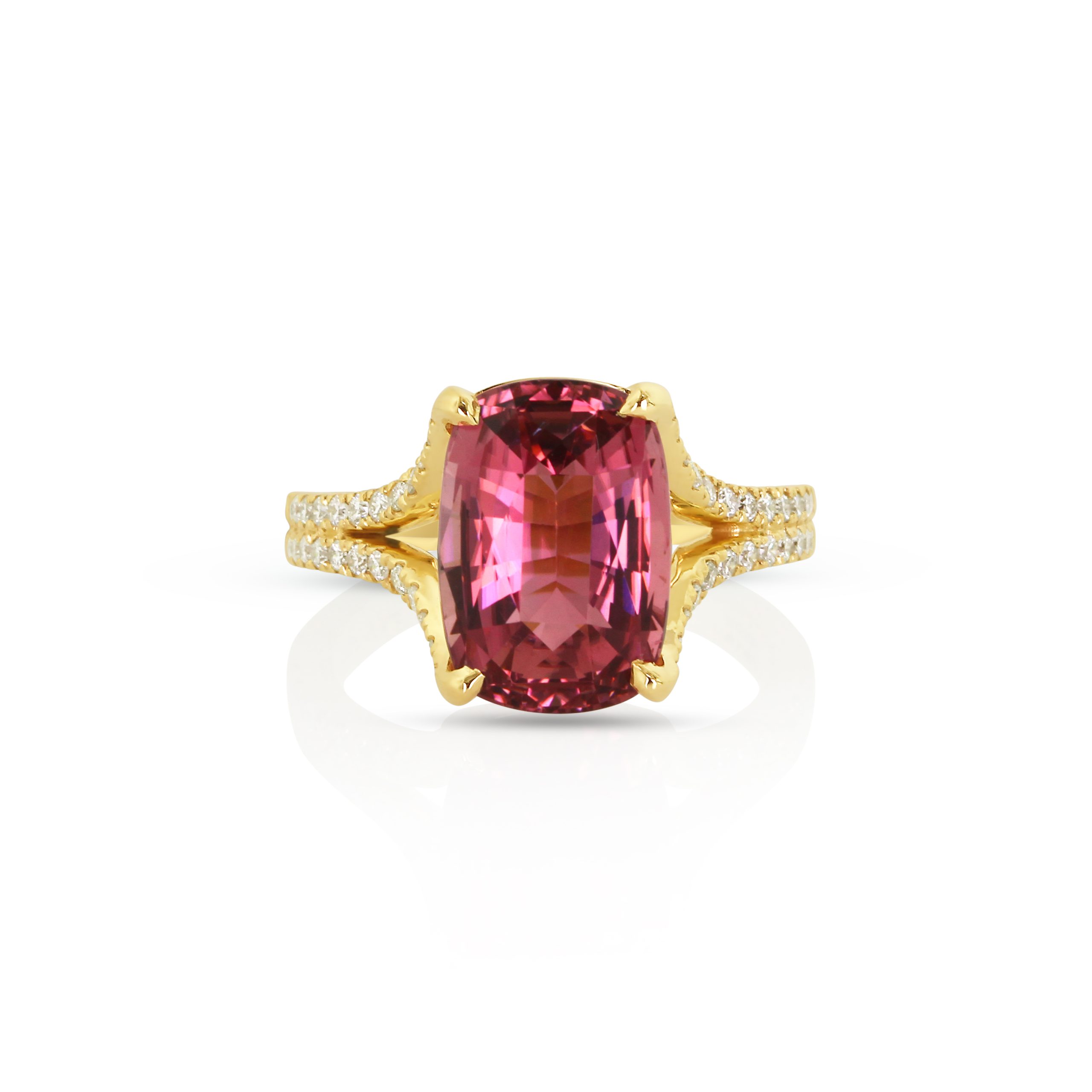 This radiant ring showcases a 5.46ct untreated cushion-cut pink tourmaline, ablaze with vivid color and feminine allure. Set in rich 18kt yellow gold, the split shank is adorned with 0.50ct of brilliant diamonds for added sparkle.