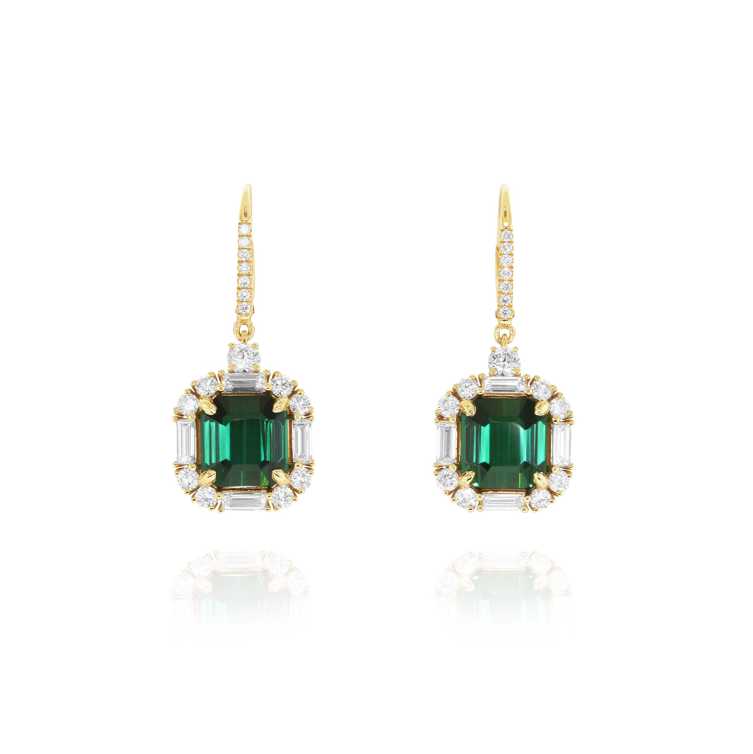 Set in radiant 18kt yellow gold, these drop earrings highlight 9.58 of emerald-cut green tourmalines, encircled by 2.23 of diamonds. Their regal color and dramatic silhouette make them unforgettable. Designed for grand occasions and lavish styling.