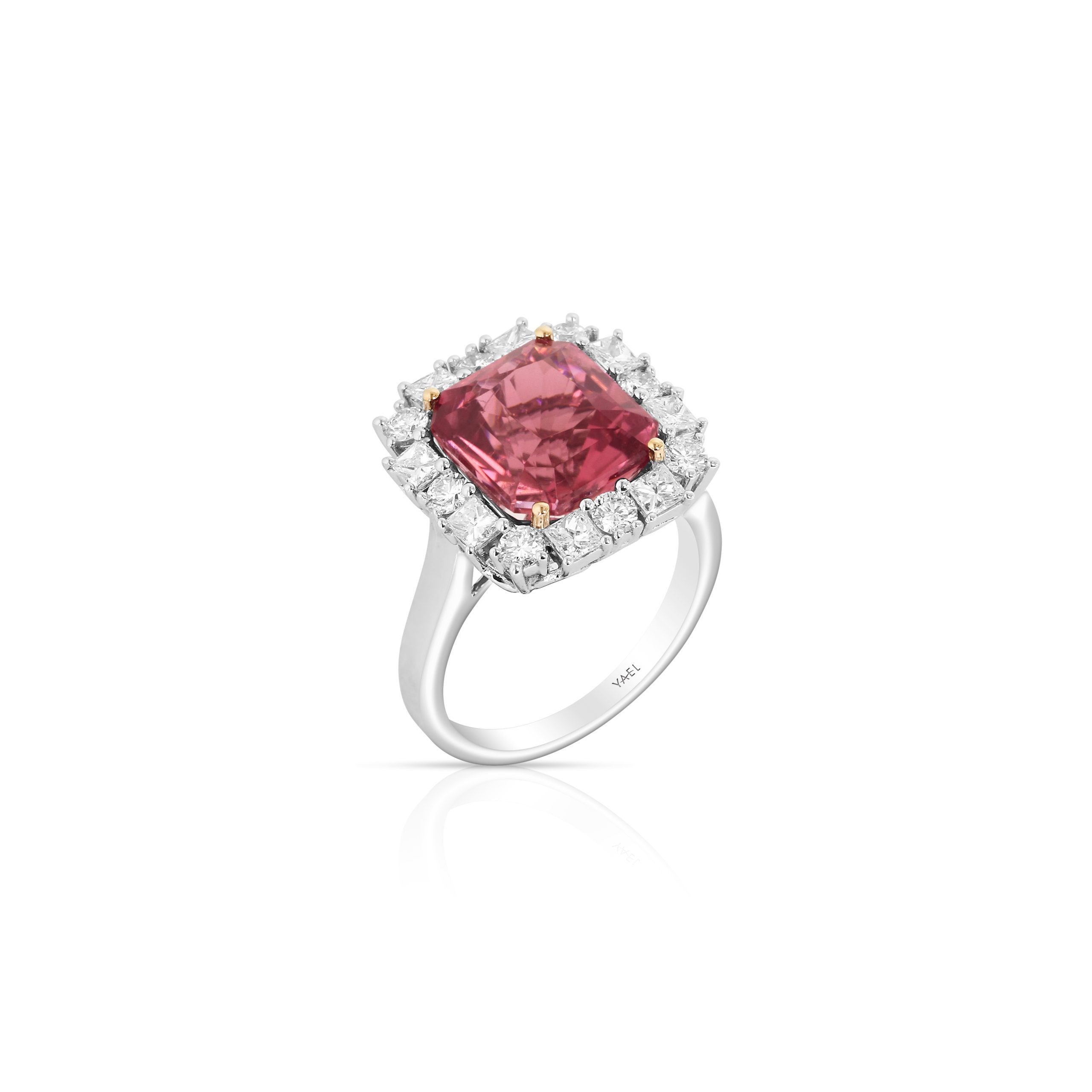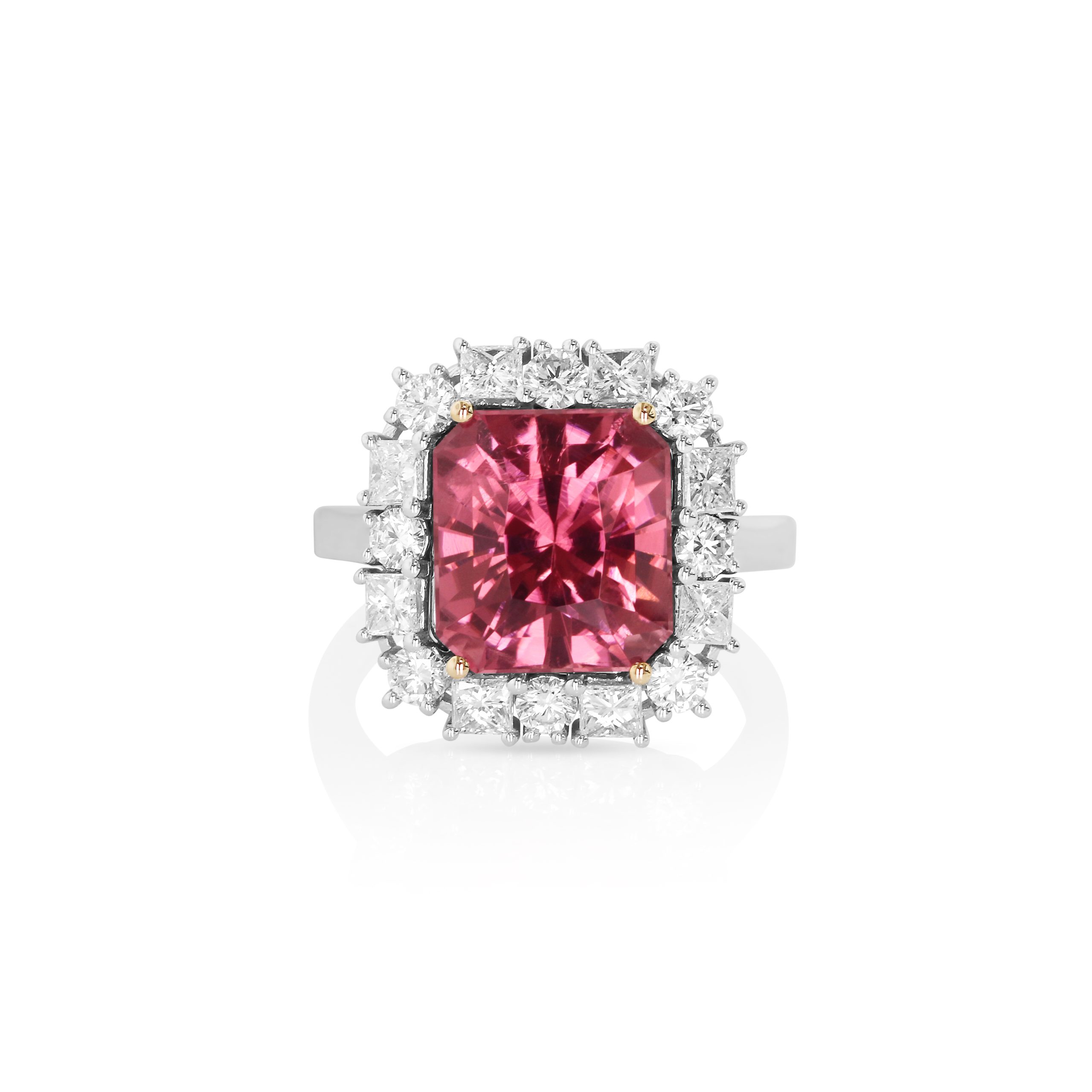 Set in 18kt rose and white gold, this bold 5.97 radiant pink tourmaline is accented with 0.65 of white round diamonds. Its geometric profile and rich color make a powerful impression. A statement of modern romance and timeless allure.