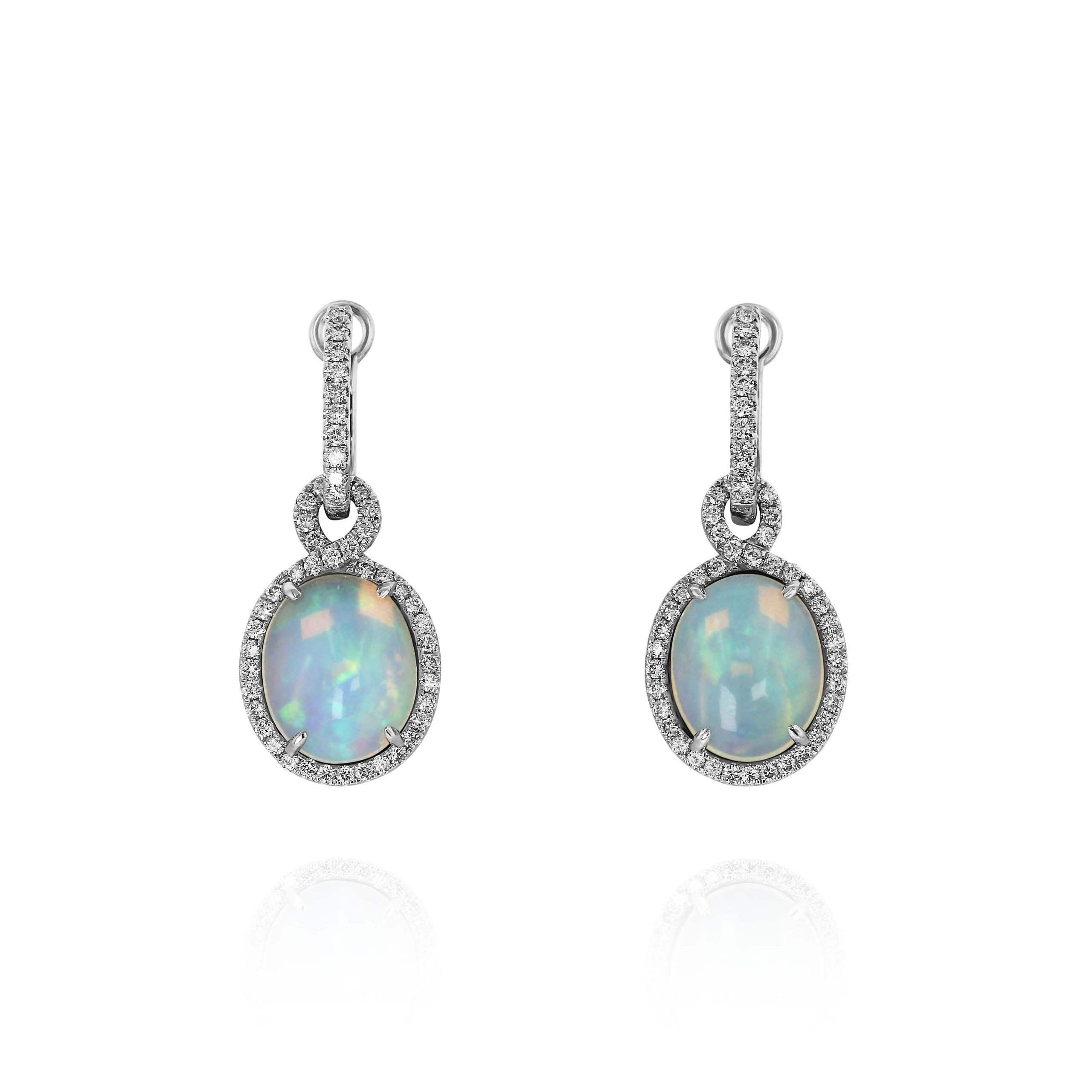 These elegant earrings feature 4.83 oval white opals framed by 0.67 of shimmering round diamonds. Perfe for adding refined brilliance to special occasions.