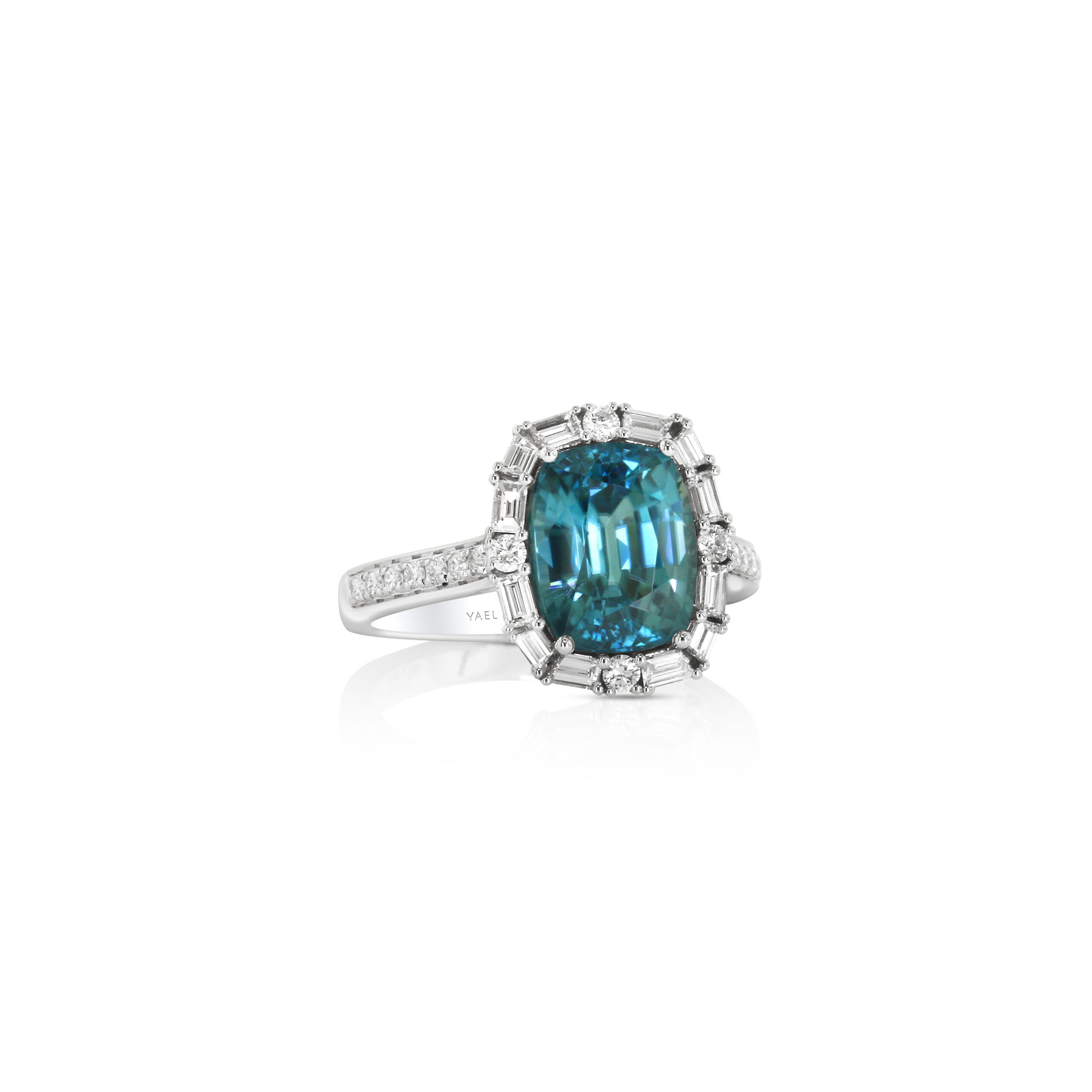 Crafted in luminous 14kt white gold, this ring centers a vibrant 5.23ct cushion-cut blue zircon, alive with deep teal brilliance. Framed by a sparkling halo of 0.65ct in baguette and round diamonds, the setting enhances the gem’s striking color and vintage-inspired silhouette. A refined yet statement-worthy piece.