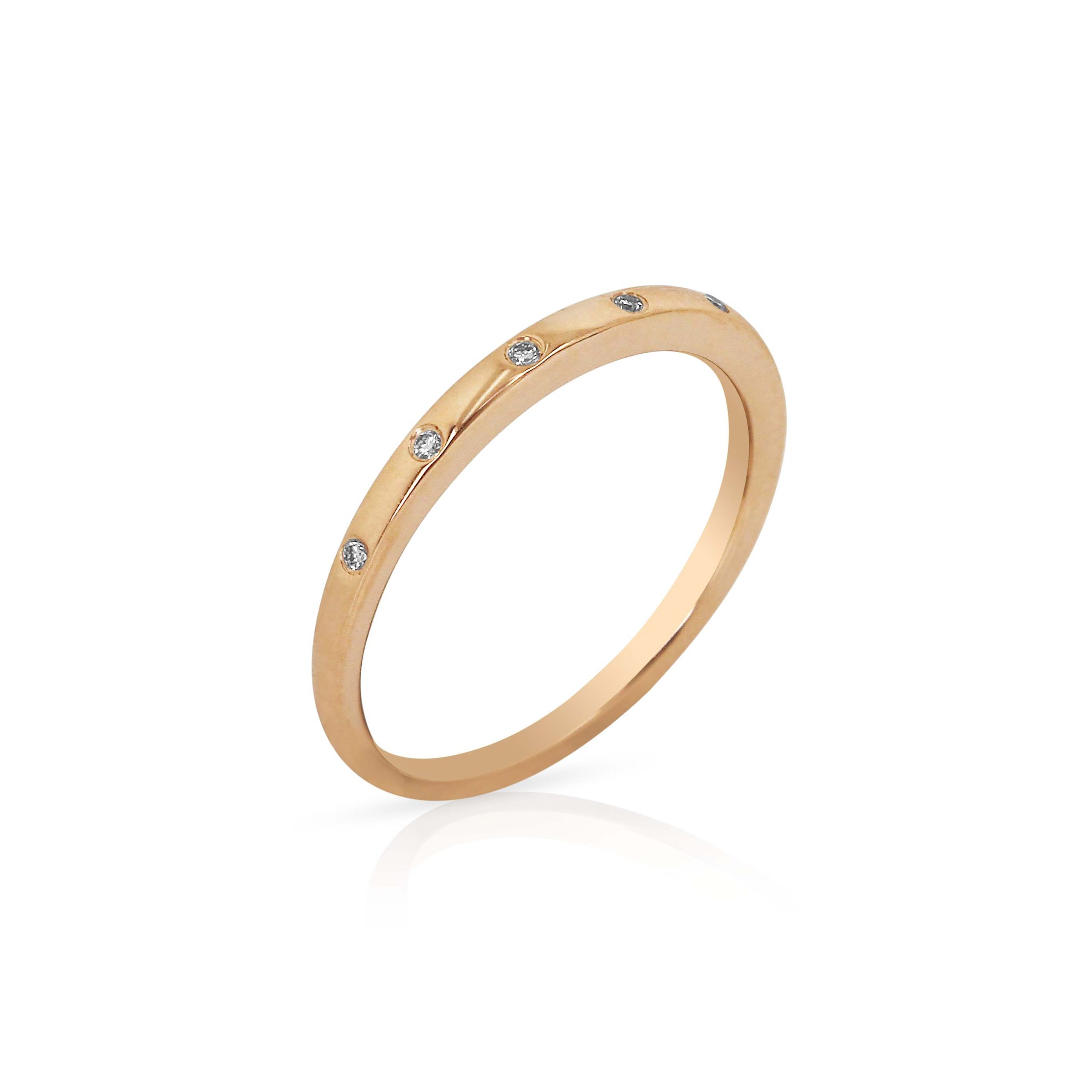 This slim 18kt rose gold ring features 0.04 of small round diamonds. Delicate, feminine, and effortlessly versatile. A refined touch for everyday wear.