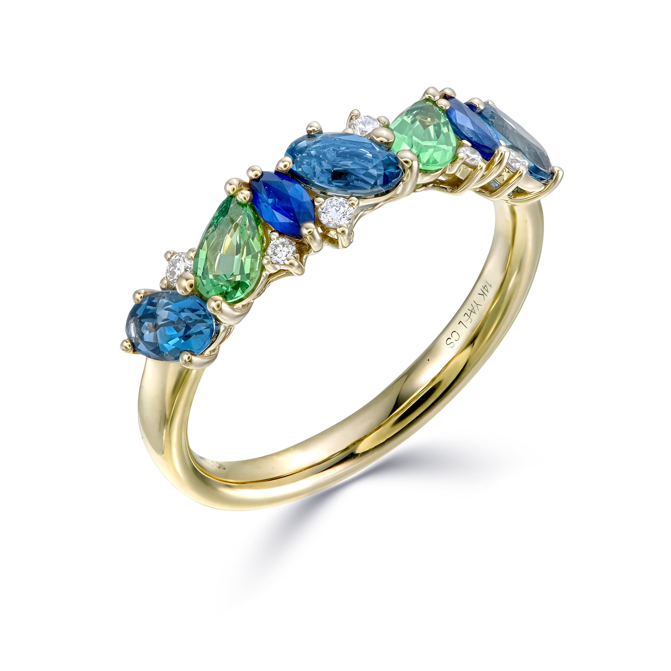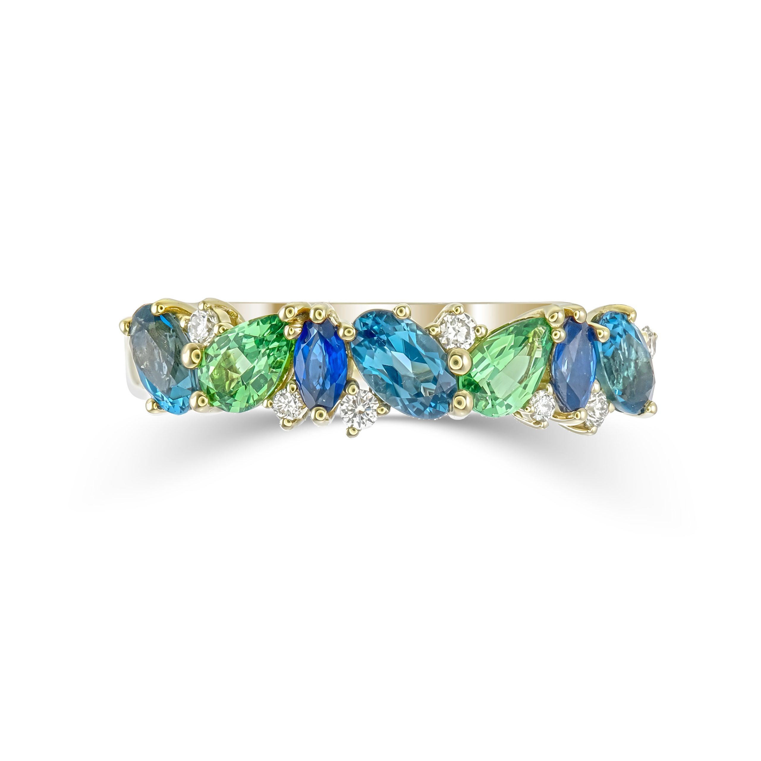A fresh twist on a classic, this 14kt yellow gold band is adorned with alternating blue topaz, tsavorite, and blue sapphire in a unique marquise and oval layout. Delicate round diamonds add a sparkling finish to this colorful and lively design.