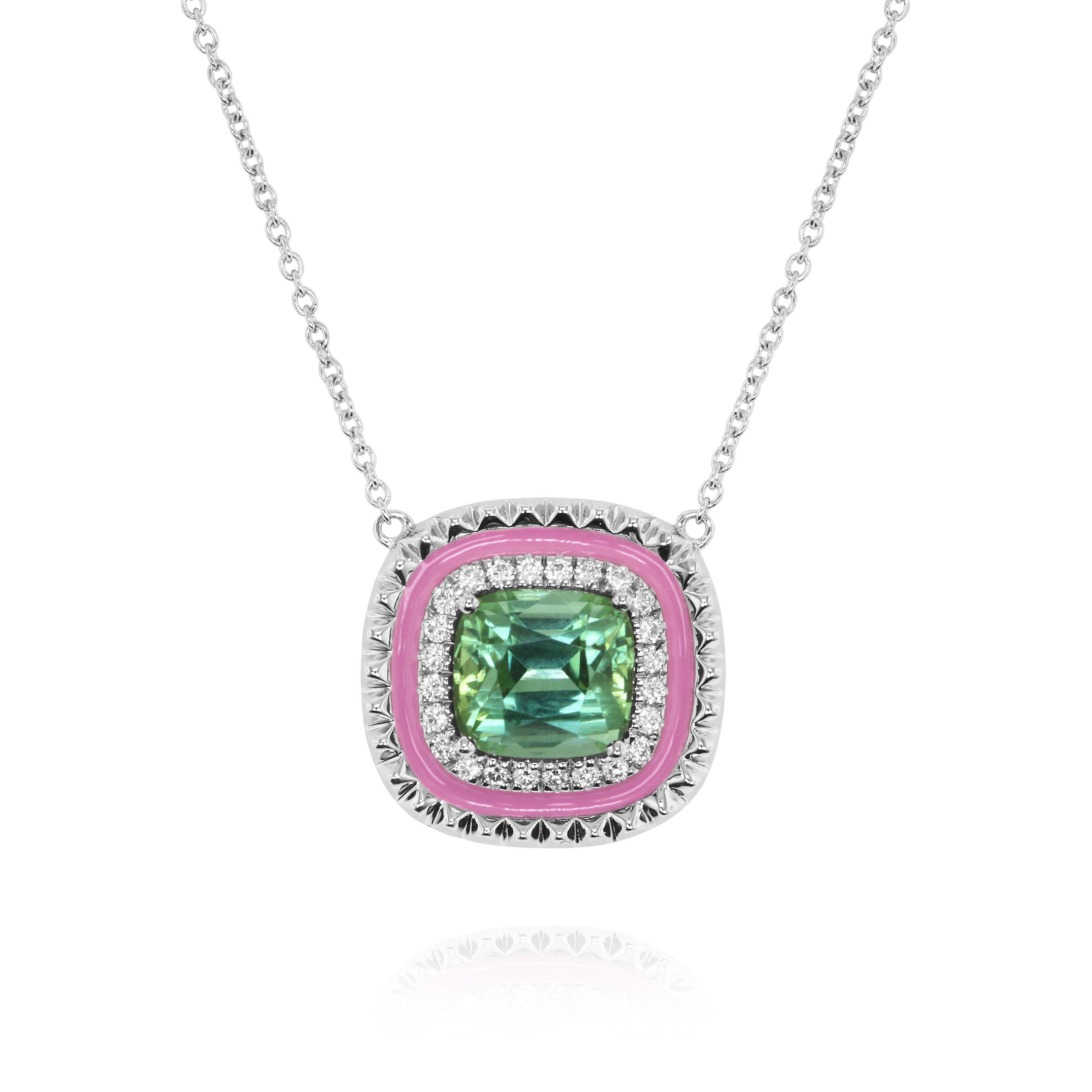 Set in 18kt white gold, this ring highlights a 3.04 green tourmaline framed by soft pink enamel and accented with 0.32 of diamonds. The mix of color is romantic and refreshing. A perfe blend of bold and feminine energy.