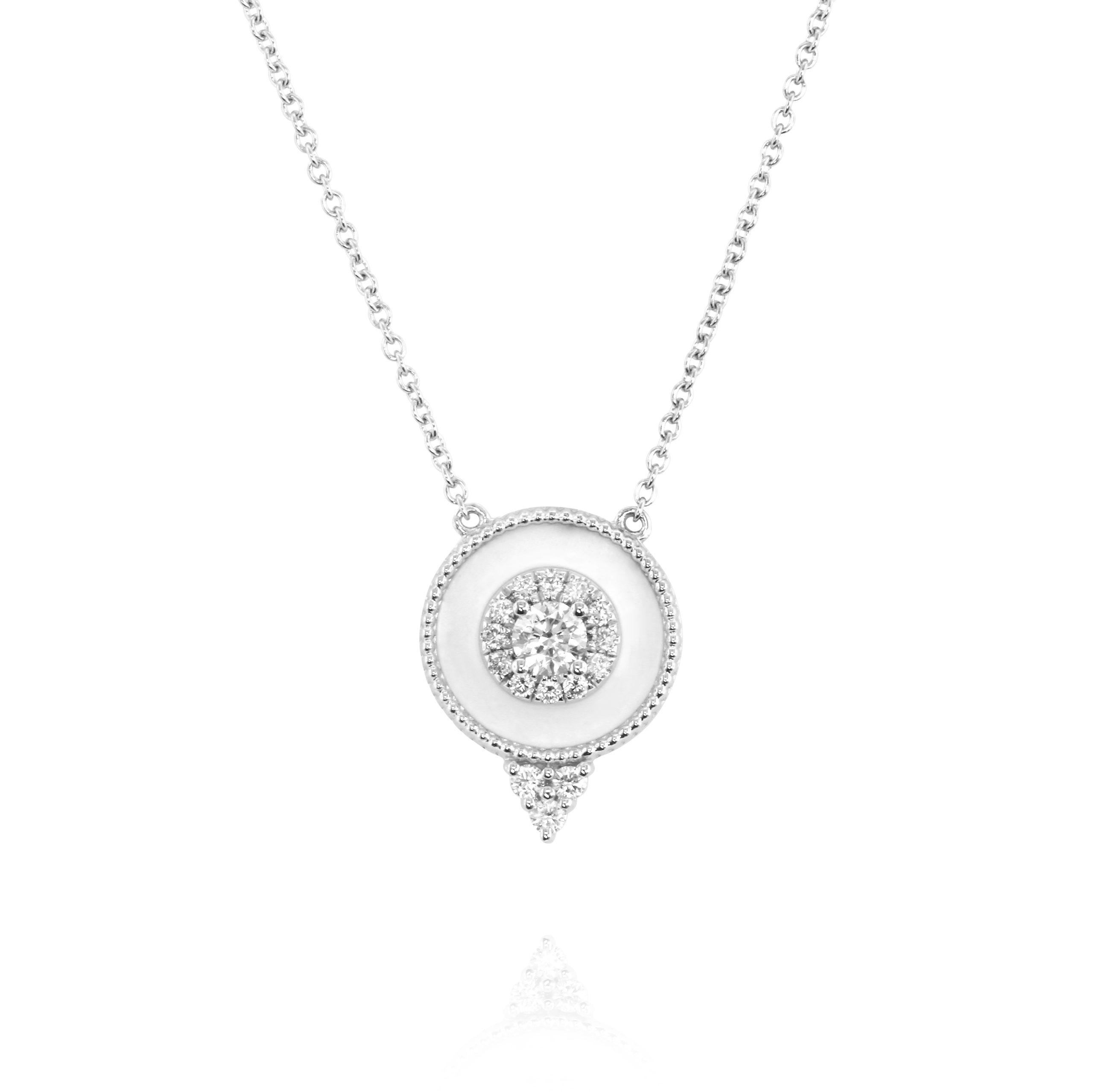This exquisite pendant in 14kt white gold with white enamel highlights a 0.19 round diamond framed by 0.14 of additional diamonds. A sophisticated design, ideal for layering or wearing solo.